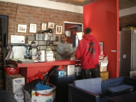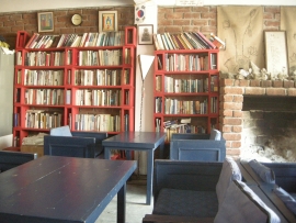 Inredningen är personlig och det påminner om vardagsrummet hemma hos någon. Bilder på Papa Ghee och Ramana Maharshi pryder väggarna och här finns böcker att låna med blandade titlar från hela världen.